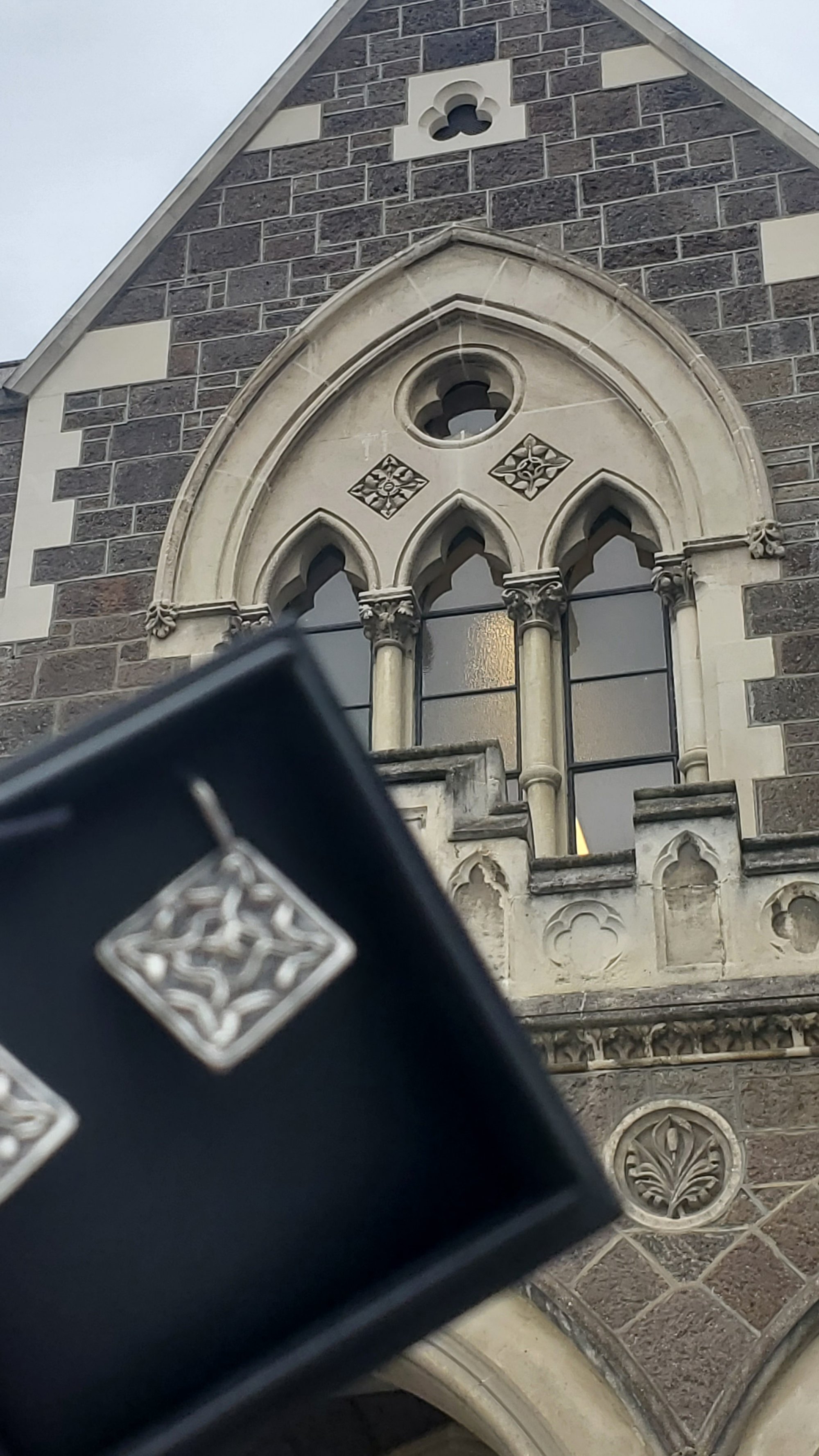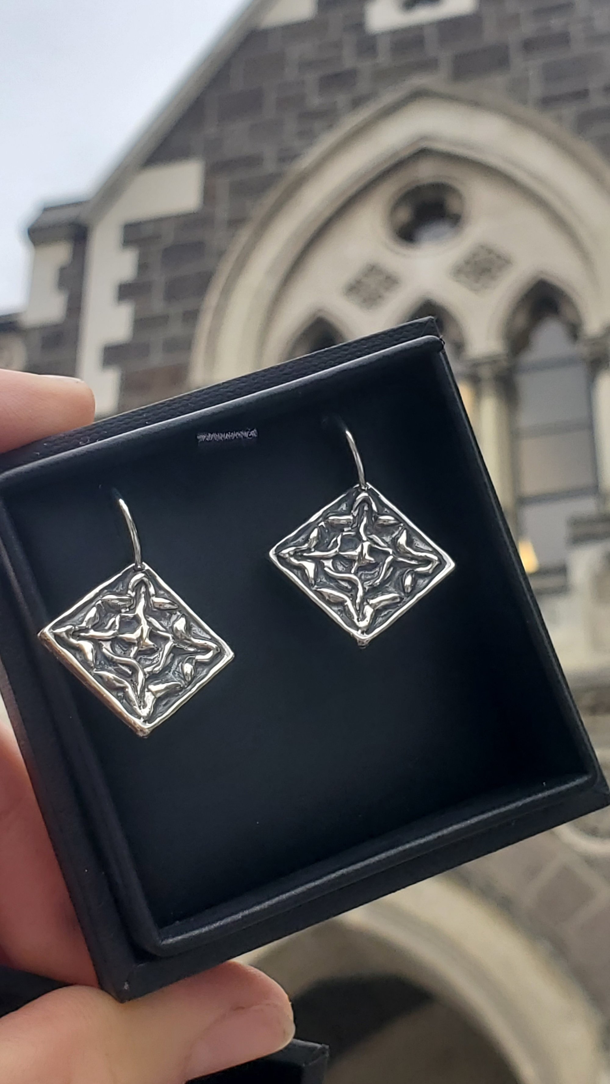 Solid sterling silver earrings with the design based off a carved tile at Te Matatiki Toi Ora The Arts Centre Christchuch.